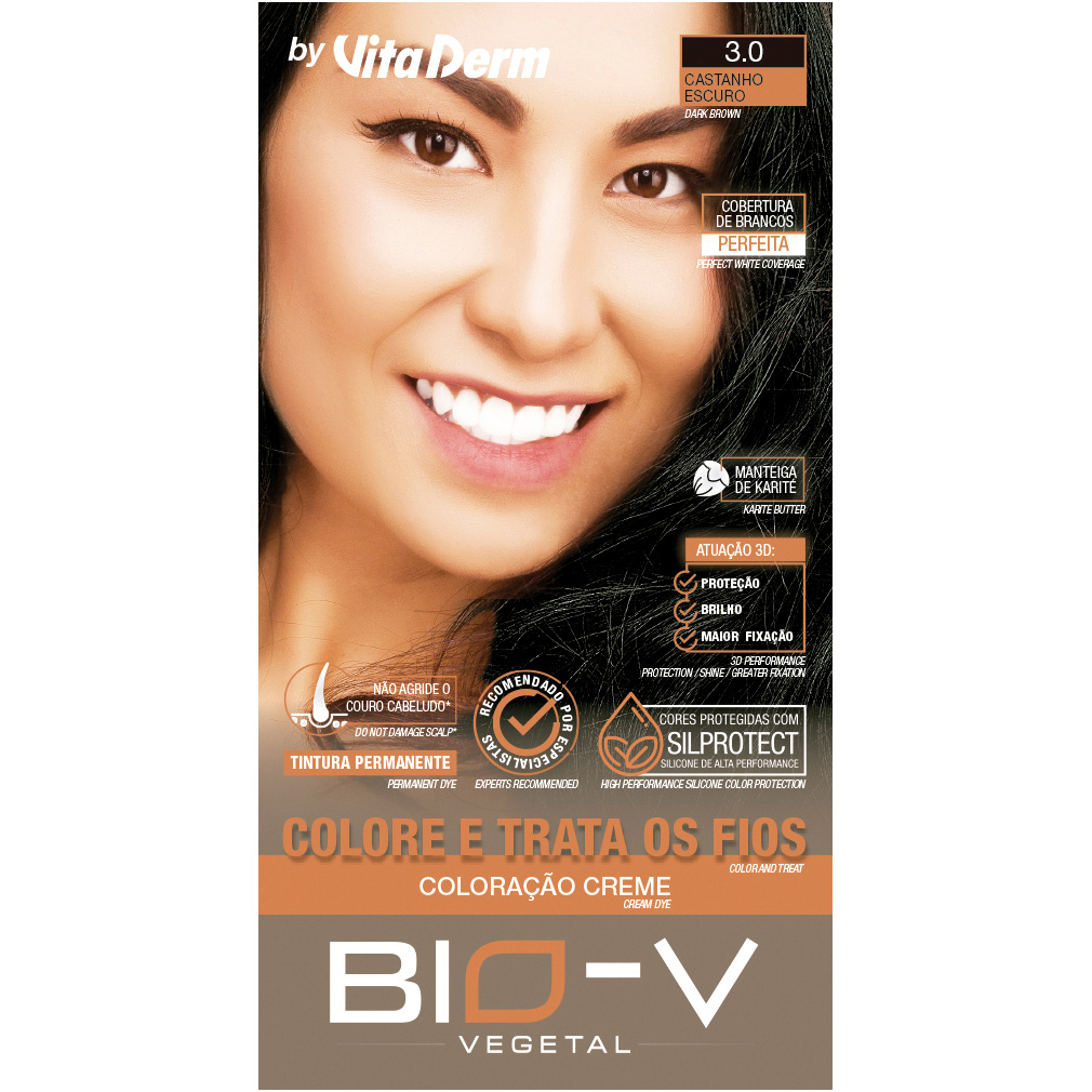 A coloração Creme Bio-V Vegetal Color Hidrat desenvolvida pela Vita Derm, tem sua fórmula enriquecida com manteiga de karité  e silprotect proporcionando emoliência e brilho aos cabelos, deixando-os com aspecto saudável e natural.