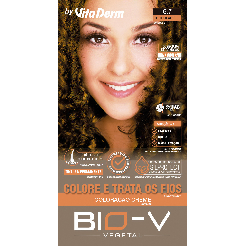 A coloração Creme Bio-V Vegetal Color Hidrat desenvolvida pela Vita Derm, tem sua fórmula enriquecida com manteiga de karité  e silprotect proporcionando emoliência e brilho aos cabelos, deixando-os com aspecto saudável e natural.