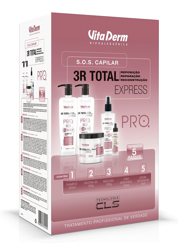O Kit da Linha SOS Capilar 3R Total Express, foi desenvolvida para potencializar a reconstrução e recuperação da cutícula capilar, além de atuar na reposição da massa perdida, reorganizando suas ligações e devolvendo força e elasticidade aos cabelos fragilizados (junção da tecnologia cls à sericina cationica hidrolisada). Indicação: Reposição, reparação e reconstrução capilar. Produto hipoalergênico.