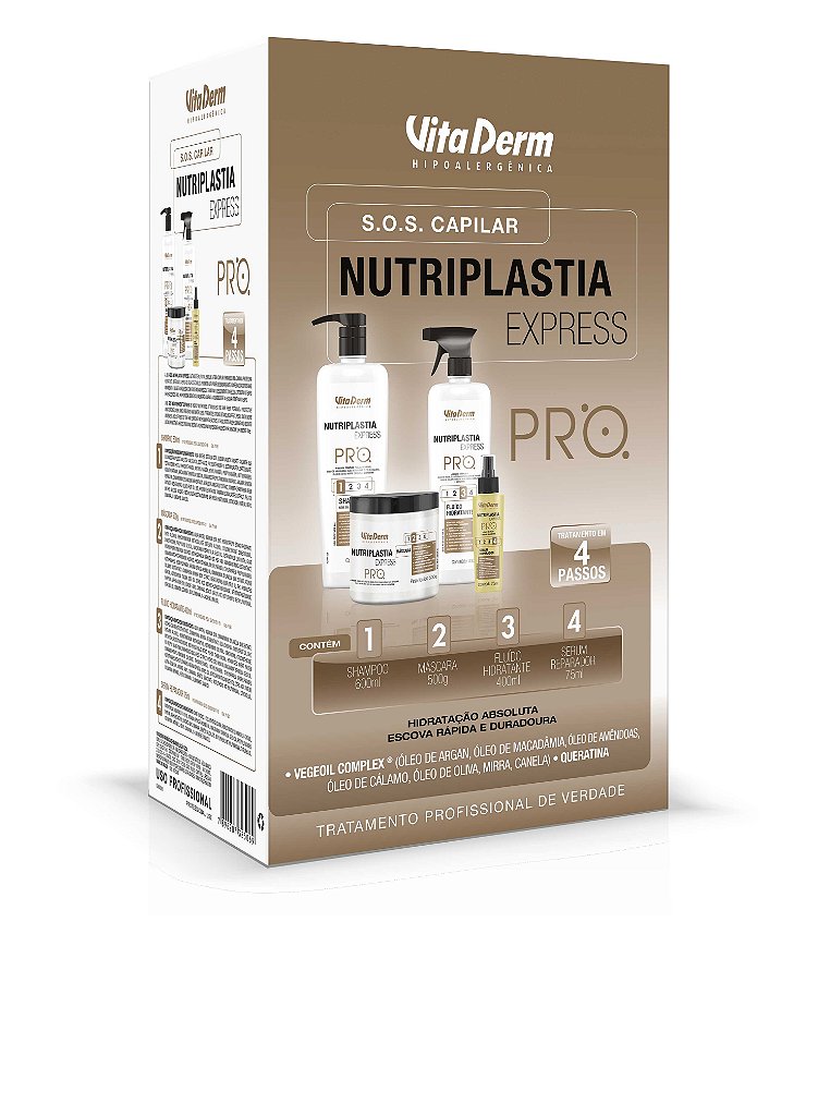 Composição do kit: 01 un shampoo SOS Nutriplastia – 600 ml. 01 un mascara SOS Nutriplastia – 500 gr. 01 un fluido hidratante SOS Nutriplastia – 400 ml. 01 un serum reparador SOS Nutriplastia – 75 ml.