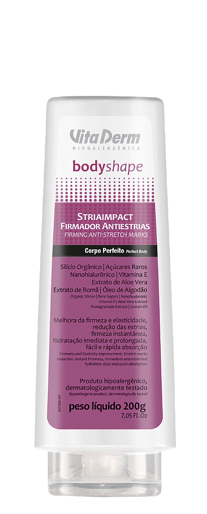 O Creme Firmador Antiestrias Striaimpact Body Shape possui fórmula de alta performance, não oleosa, com fácil e rápida absorção. Enriquecido com silício orgânico, considerado um hidratante biológico, promove a manutenção da hidratação da pele por mais tempo. Já os açucares raros, estimulam a produção de fibras de colágeno e elastina, além de promover a hidratação imediata e prolongada da pele, deixando-a mais lisa e tonificada. O extrato de pitpadenia (angico), promove hidratação profunda da pele, melhorando sua qualidade.