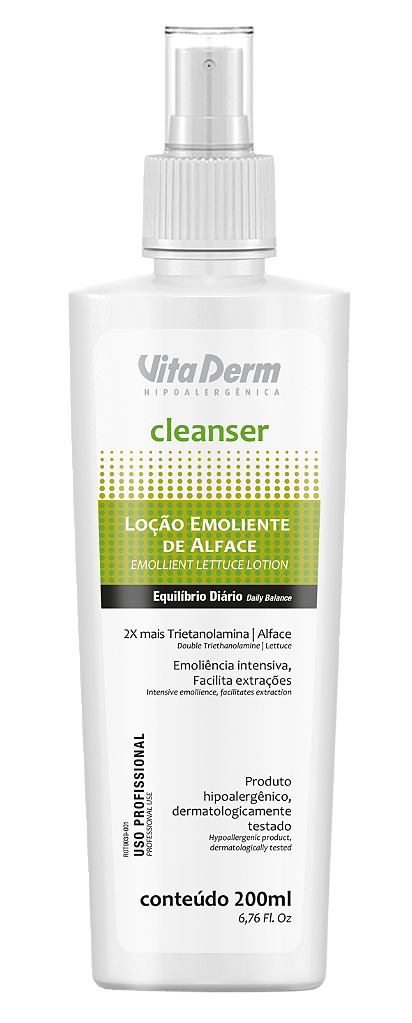 Devido as propriedades de emoliência e umectação do alface, esta loção atua sobre a pele, facilitando as extrações de comedões, agora mais concentrada, com o dobro de trietanolamina. Indicação: indicado no procedimentos de limpeza de pele. promove a emoliência dos comedões.