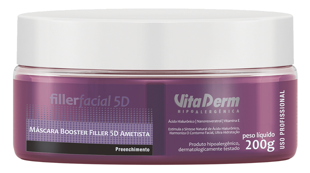A Máscara Booster Filler 5D foi desenvolvida para promover o preenchimento, não invasivo. Enriquecida com vitamina E, que possui ação antioxidante, ácido hialurônico, responsável pela redensificação natural da pele e nanoresveratrol que inibe a formação de radicais livres e previne o envelhecimento cutâneo, além de promover a hamonização facial.