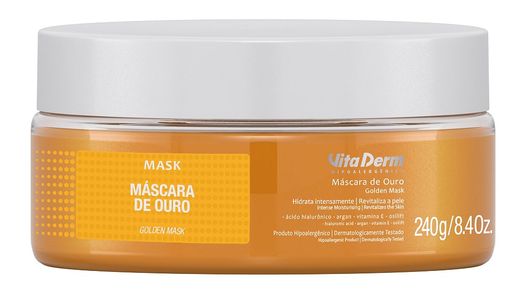 A Máscara de Ouro da Vita Derm foi desenvolvida com ativos ultra hidratantes, como ácido hialurônico e argan, que auxiliam na revitalização e resgate da radiância natural da pele. É enriquecida com vitamina e e osilift.