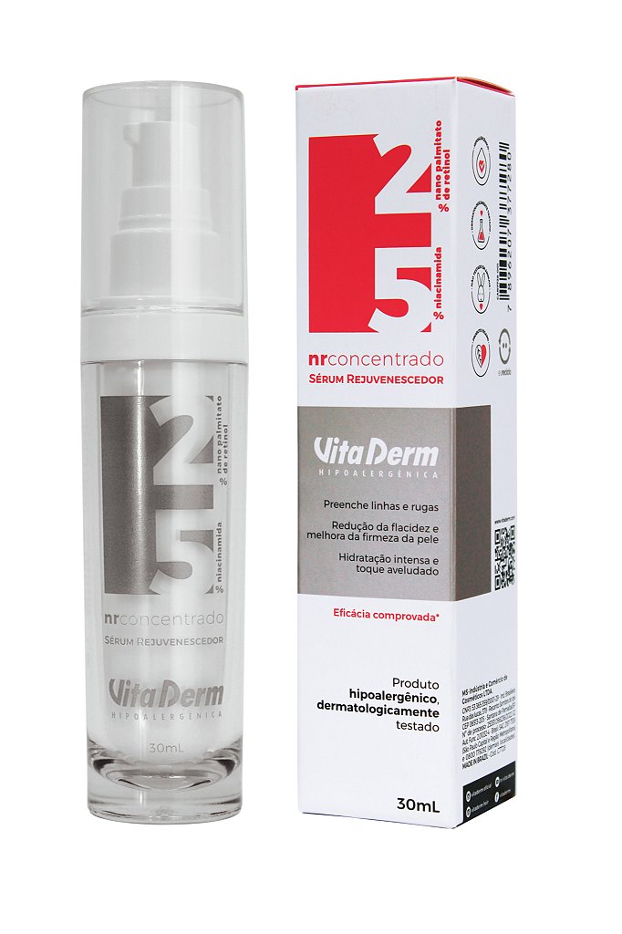 NR Concentrado é um sérum Rejuvenescedor com 2% de Palmitato de Retinol em tecnologia nano mais 5% de Niacinamida. Com fórmula minimalista ele revitaliza, hidrata e rejuvenesce. Melhora a firmeza e elasticidade, além de preencher rugas e linhas de expressão. Seus ativos combinados promovem melhora do contorno facial e aspecto uniforme do tom e textura da pele.