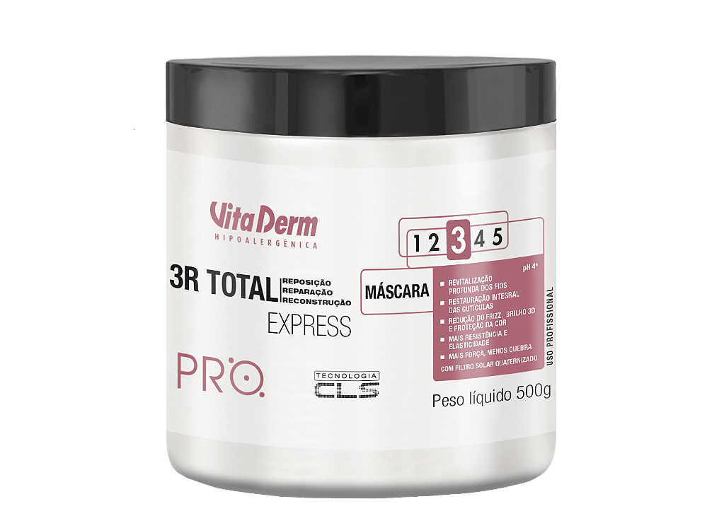 A Máscara Capilar 3R Total, passo 02 da linha (kit) SOS Capilar 3R Total Express, foi desenvolvida para potencializar a reconstrução e recuperação da cutícula capilar, além de atuar na reposição da massa perdida, reorganizando suas ligações e devolvendo força e elasticidade aos cabelos fragilizados (junção da tecnologia cls à sericina catiônica hidrolisada). Indicação: Reposição, reparação e reconstrução capilar. produto hipoalergênico.