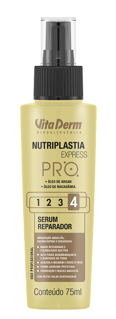Após aplicação do Fluído Hidratante SOS Nutriplastia Express (passo 3), espalhar algumas gotas do Serum Reparador SOS Nutriplastia Express (passo 04) na palma das mãos e aplicar com os dedos nas pontas dos cabelos secos ou úmidos para finalizar (pode ser escovado ou deixar natural).