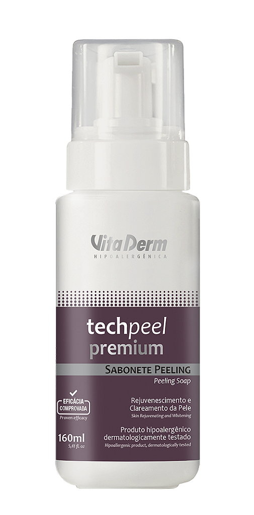 O Sabonete Peeling Tech Peel Premium possui eficácia comprovada, fórmula hipoalergenica e dermatologicamente testada. Promove limpeza profunda e purifica a pele. Contem alfa hidroxiácidos em nanocápsulas, que proporcionam renovação, rejuvenescimento e clareamento da pele, o ácido salicilico que controla a oleosidade excessiva e os extratos de goji berry e gengibre, com ação antioxidante e desintoxicante. **eficácia percebida por voluntários no uso diário, conforme no modo de uso.