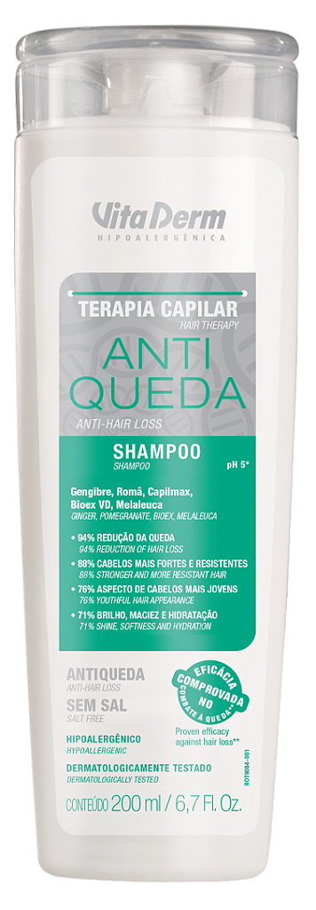 O Shampoo Anti-queda possui eficácia comprovada** e efetiva no combate a queda dos cabelos, promove aumento da densidade capilar (novos fios), reduz a quebra dos fios ao lavar, proporciona aspecto de cabelos mais jovens, soltos, macios e hidratados. Tem ph 5, respeita o ph fisiológico dos fios, formula inteligente, sem adição de sal.