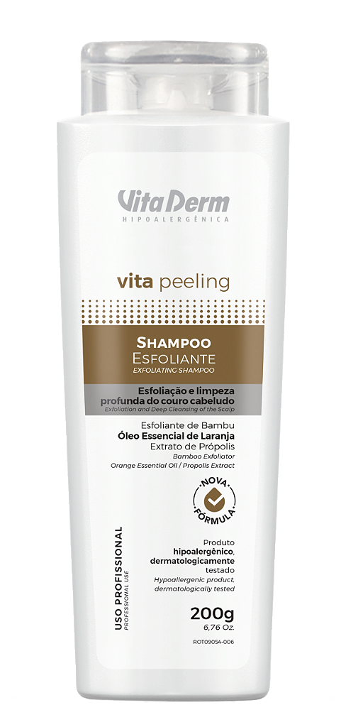 O Shampoo Esfoliante Vitapeeling foi desenvolvido a base de própolis, óleo essencial de laranja, o produto remove o acumulo de resíduos e a oleosidade excessiva do cabelo, preparando-o para a sequencia de tratamento, otimizando o próximo passo, alem de deixar uma agradável sensação de frescor e bem-estar.